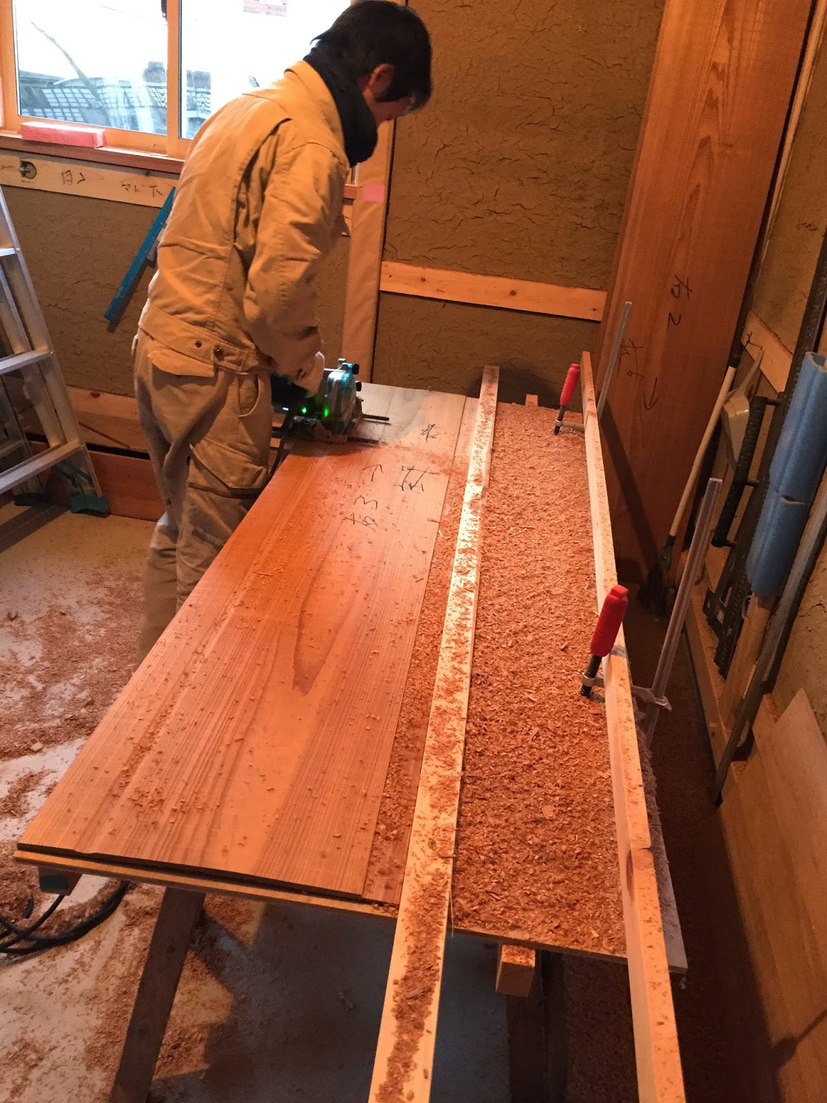 竿縁天井板を下ごしらえする、樋口大工さんです。